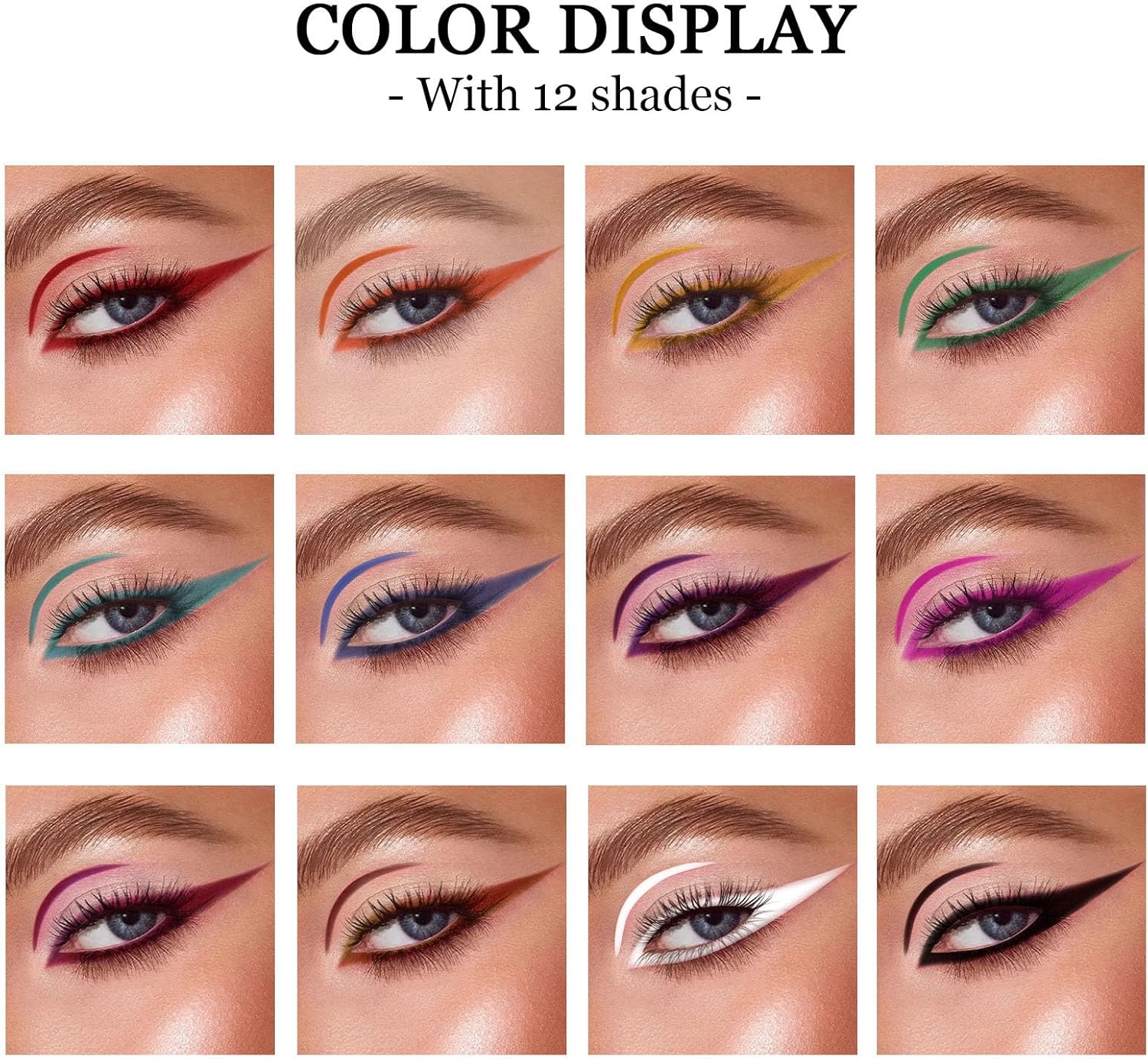 “12 Colors Liquid Eyeliner Set, perfect for adding a splash of color to any makeup look! This vibrant collection features a range of colorful eyeliners that deliver long-lasting, pigmented results.