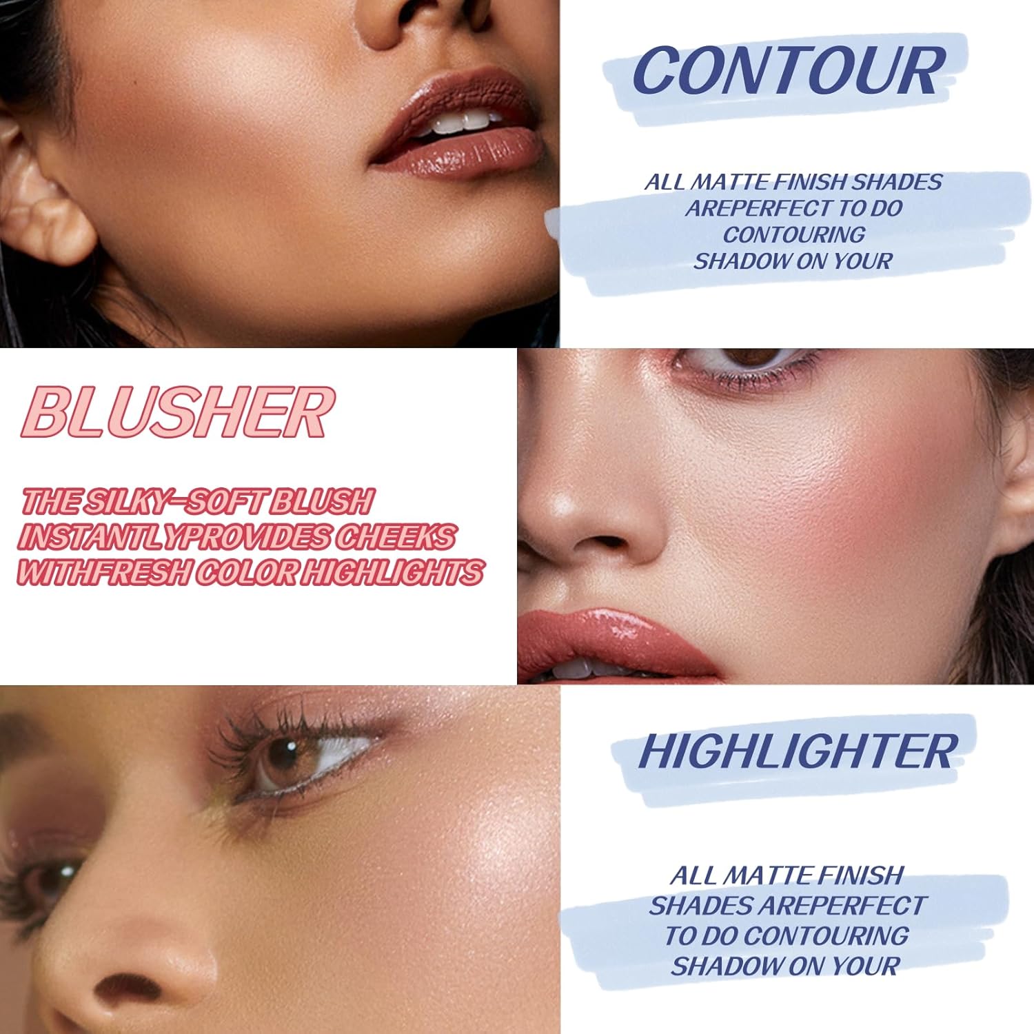 【Convenient & Unique】The product is designed three in one, one palette contains highlighter, contour and blush, and eye shadow, making it more convenient to use. Delicate, silky and easy to smudge and create a three-dimensional silhouette.