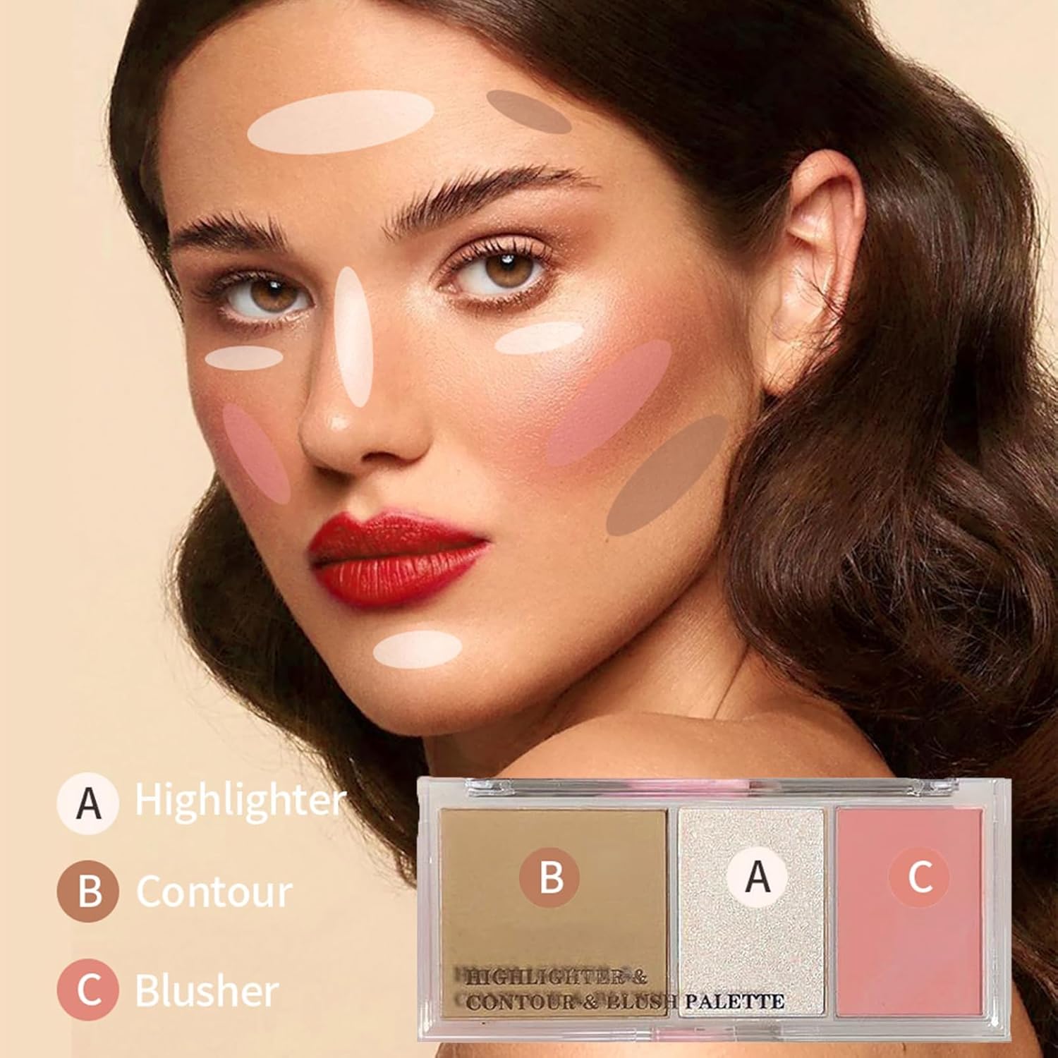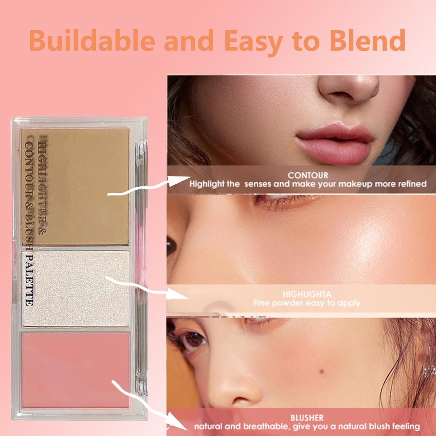 【3 Shades Makeup Palette】3 shades to highlight, contour and blush. This make up plate easy to apply multitasker for cheeks, face, and eyes.The lightweight formula makes creating gorgeous, sculpted cheekbones easy. It is easy to blend and buildable for a natural or dramatic look.