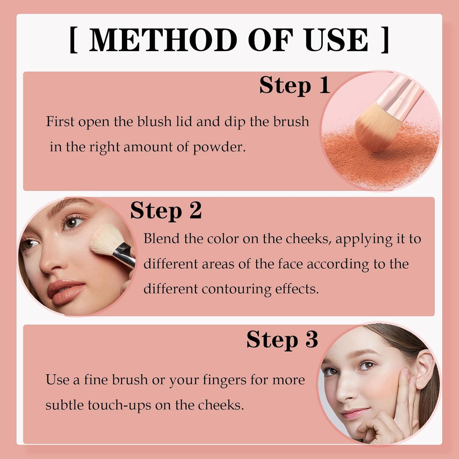 【PORTABLE AND EASY TO USE】 Three-color Blusher is compact and easy to use, comes with a fiber brush. It can easily meet your makeup needs no matter whenever and wherever you are.