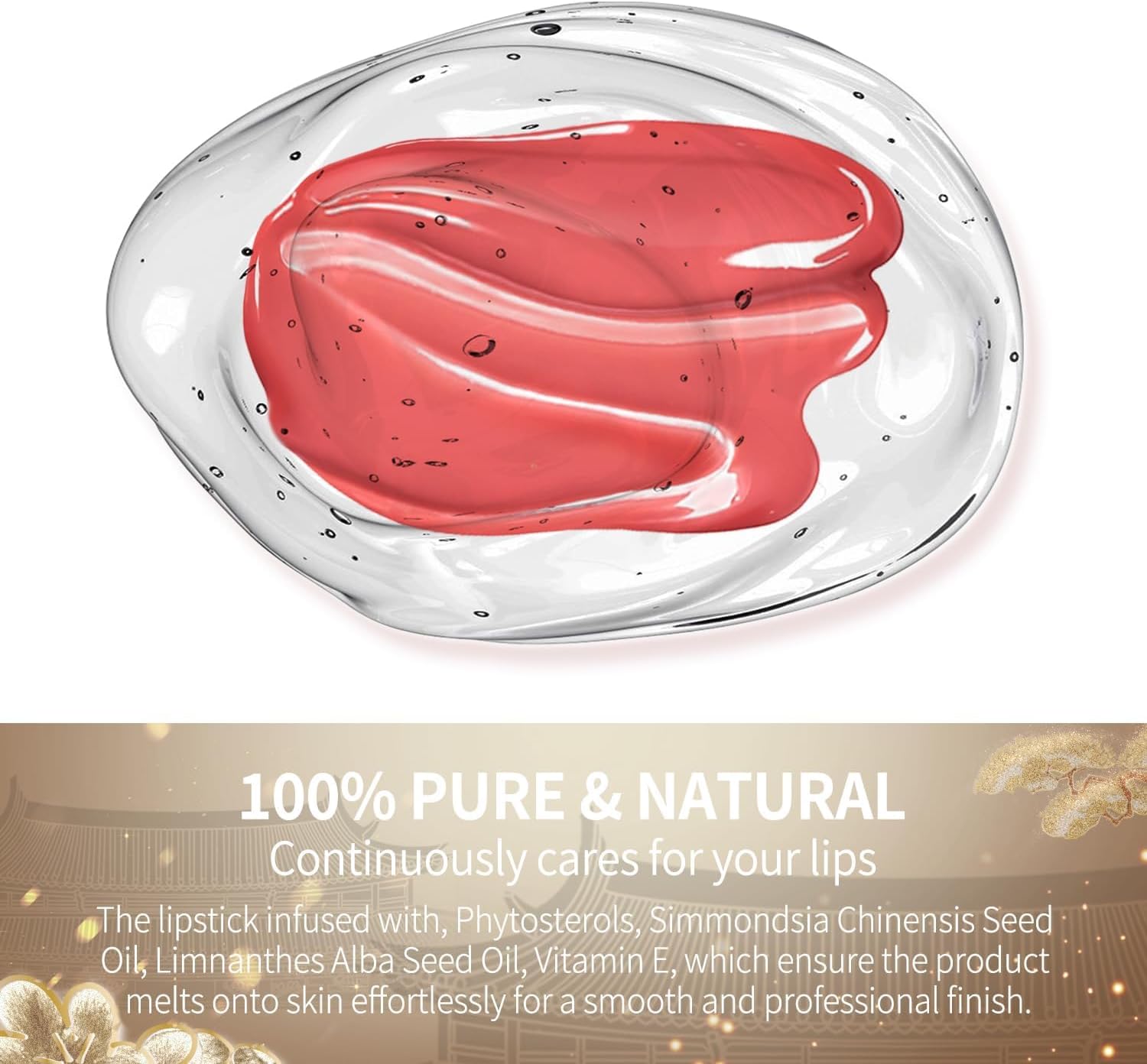 【SKIN-LOVING INGREDIENTS】 The lipstick infused with, Phytosterols, Simmondsia Chinensis Seed Oil, Limnanthes Alba Seed Oil, Vitamin E, which ensure the product melts onto skin effortlessly for a smooth and professional finish. It helps plump and smooth with hydration while instantly improving lips’ moisture barrier.