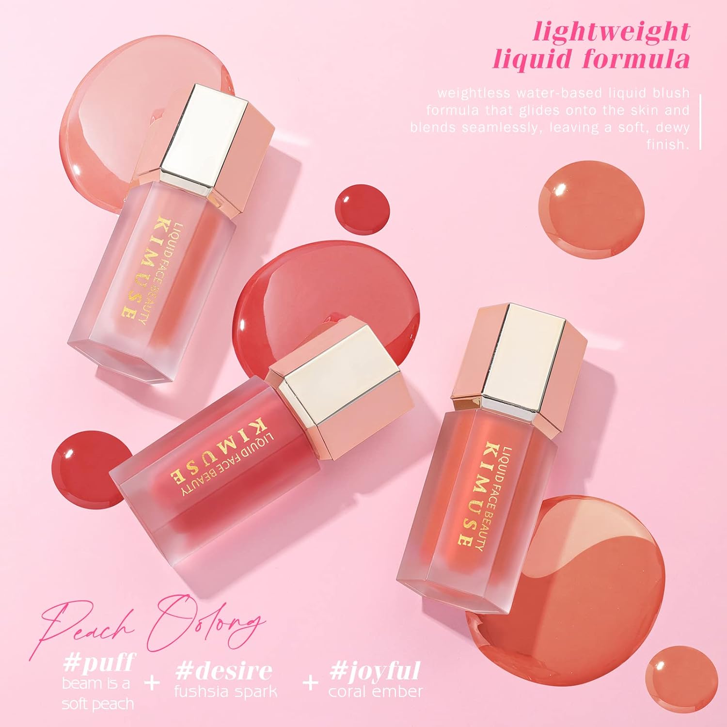 Lightweight Liquid Formula – Weightless water-based liquid blush formula that glides onto the skin and blends seamlessly, leaving a soft, dewy finish.