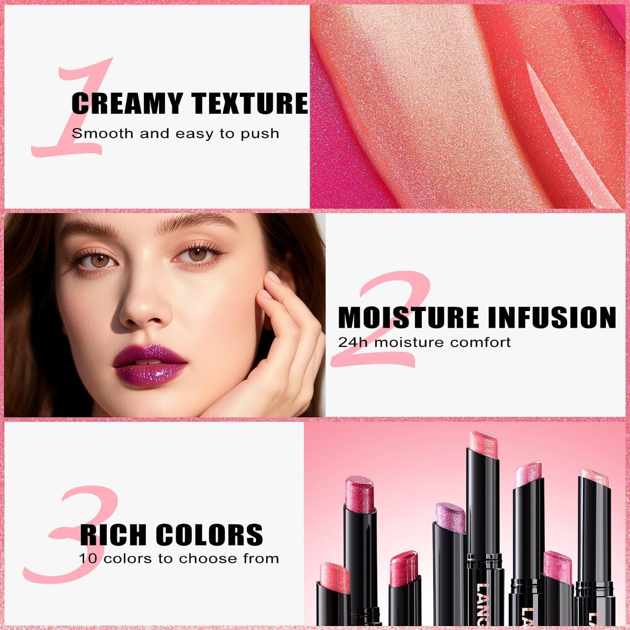 LANGMANNI 10 Colors Sparkling Lipstick Set With Angled Tip