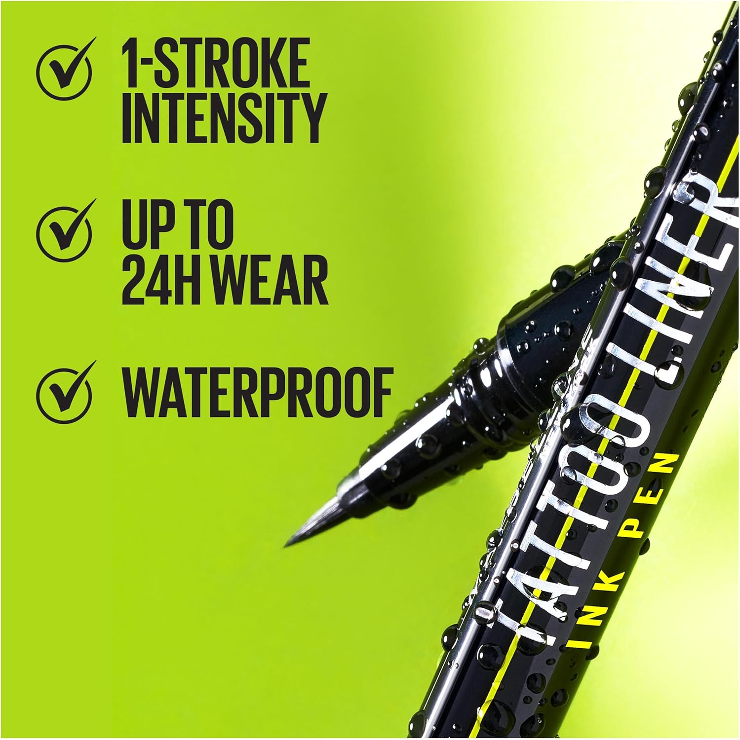 Contents: 1x Maybelline Tattoo Liner Ink Pen Eyeliner, Waterproof Brush Tip liner, Precise Lines and Tattoo impact, up to 24h wear, Colour: Jet Black