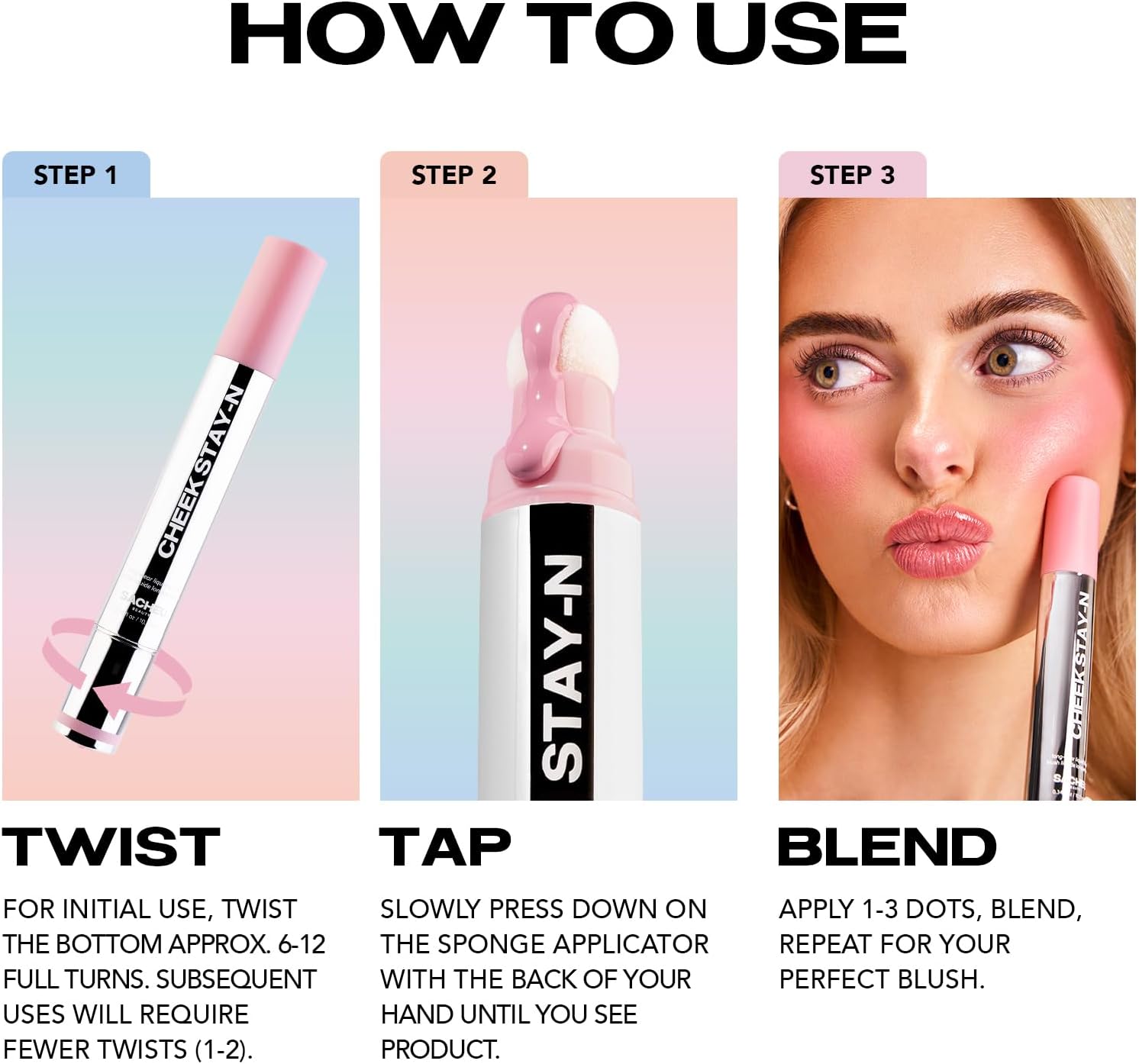 How To Use: Twist the bottom of the tube to dispense the creamy blush through the sponge tip. Apply a small amount directly onto your cheeks. Blend gently using the sponge, a brush, or your fingers with tapping motions. Gradually build up the blush for the desired intensity. Once the formula has set, enjoy long-lasting wear of your blush!