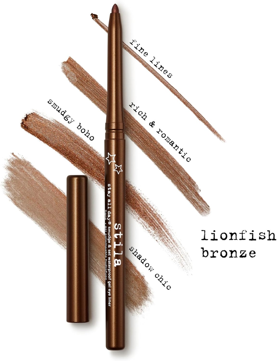 The perfect line meets the perfect smudge in this ultimate no-budge pencil. The deep bronze shimmer Lionfish Stay All Day Smudge & Set Waterproof Gel Eye Liner is a propel-repel pencil with a new conscious beauty clean profile that also has a new gel-based, long-wear formula. The soft and smooth easy-glide liner is ophthalmologist tested, waterproof, smudgeproof, waterline safe and will last up to 12 hours! With no dragging or pulling, precise application is assured and it can be used as a classic pencil liner or as a smudgy eye shadow with enhanced ‘play’ time, giving an intense and immediate colour payoff in a single swipe.